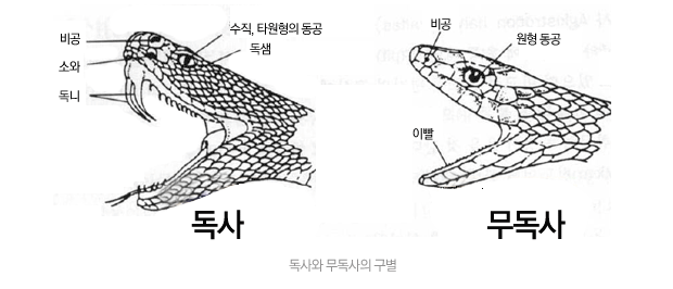 - 독이 있는 독사 : 독사의 머리는 위에서 보았을 때 삼각형이며 이빨은 두 개이며 물린 부위의 모양을 가지고 판단합니다.
