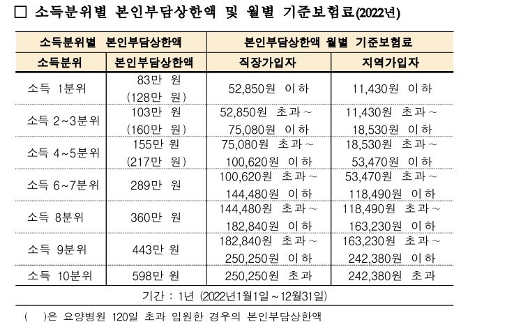 본인부담상한액 초과금을 받는 대상자는 2022년에 요양기관에서 진료를 받거나 입원을 한 대상자입니다. 병원비로 쓴 금액이 소득 분위 본인부담상한액을 초과하면 받을 수 있습니다. 2022년 개인별 본인부담상한액이 확정되어 상한액 초과금 지급 절차가 8월 23일(수)부터 시작되었습니다. 소득분위에서 보면 83만 원부터 최고 598만 원까지입니다.