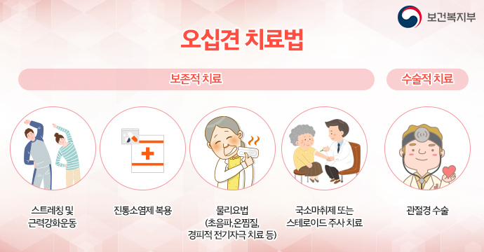 오십견의 치료는 통증 감소화 관절 운동범위 회복을 위해 이루어지면 대부분 보존적 치료를 원칙으로 합니다.