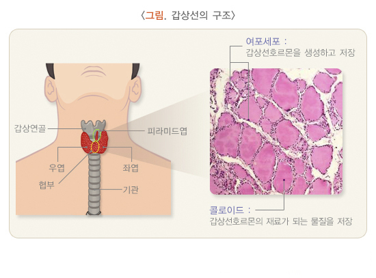 혈중에는 요오드를 3개 가진 T3(트리요오드싸이로닌)와 요오드 4개 가진 T4(싸이록신)라는 갑상선 호르몬이 있습니다. 이 호르몬은 우리 몸의 에너지 대사를 조절하고 신체 발육과 성장에도 관여하는 중요한 호르몬입니다. T4는 99% 이상이 단백질과 결합되어 있고 갑상선에 이상이 생기면 나머지의 Free T4(유리형 싸이록신) 농도가 변하게 됩니다. 그리고 T3 농도에도 이상이 생기게 됩니다. 뇌의 시상하부에서 분비된 갑상선 자극 방출 호르몬(TRH)이 갑상선 자극 호르몬(TSH)을 분비시켜 이 TSH가 갑상선을 자극합니다. T3, T4가 증가하면 TSH 분비는 억제되고 반대로 감소되면 촉진되어 갑상선 기능은 항상 일정하게 조절됩니다. T4는 갑상선 호르몬의 약 80% 이상을 차지하는 것으로 알려져 있으며 혈액 내에서 T4는 Free T4인 자유형과 단백질 결합형으로 존재합니다. T4는 간 또는 다른 조직에서 T3로 전환됩니다.